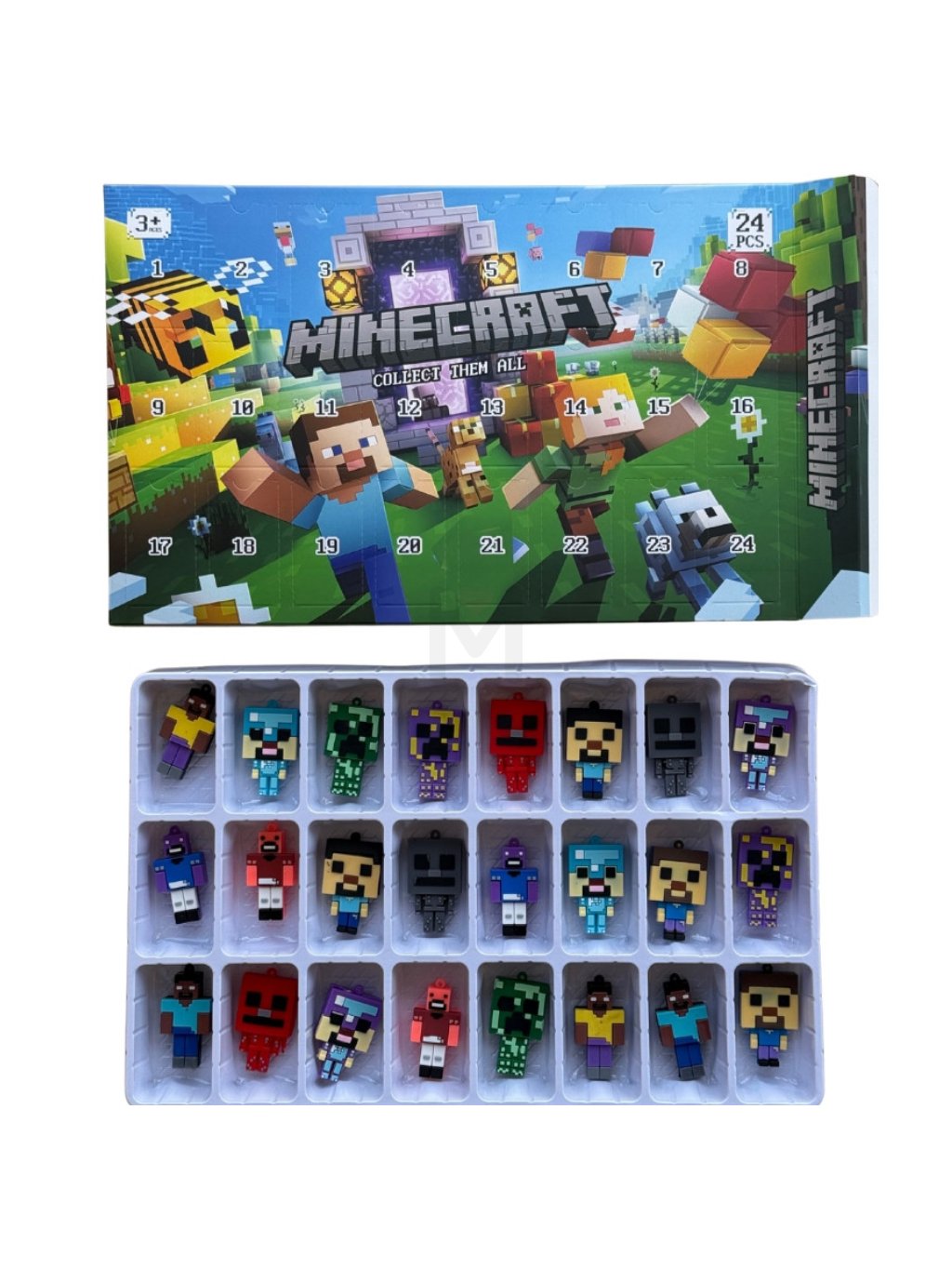 Adventní kalendář obsahuje 24 gumových figurek s motivem Minecraft v různém poměru motivů. Některé barvy se opakují.