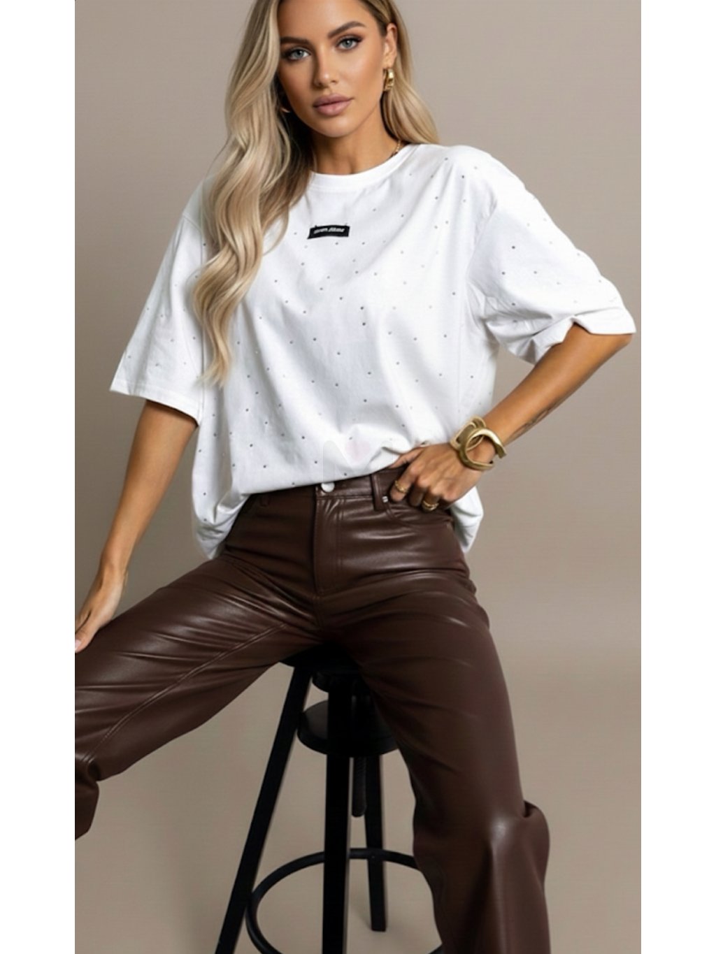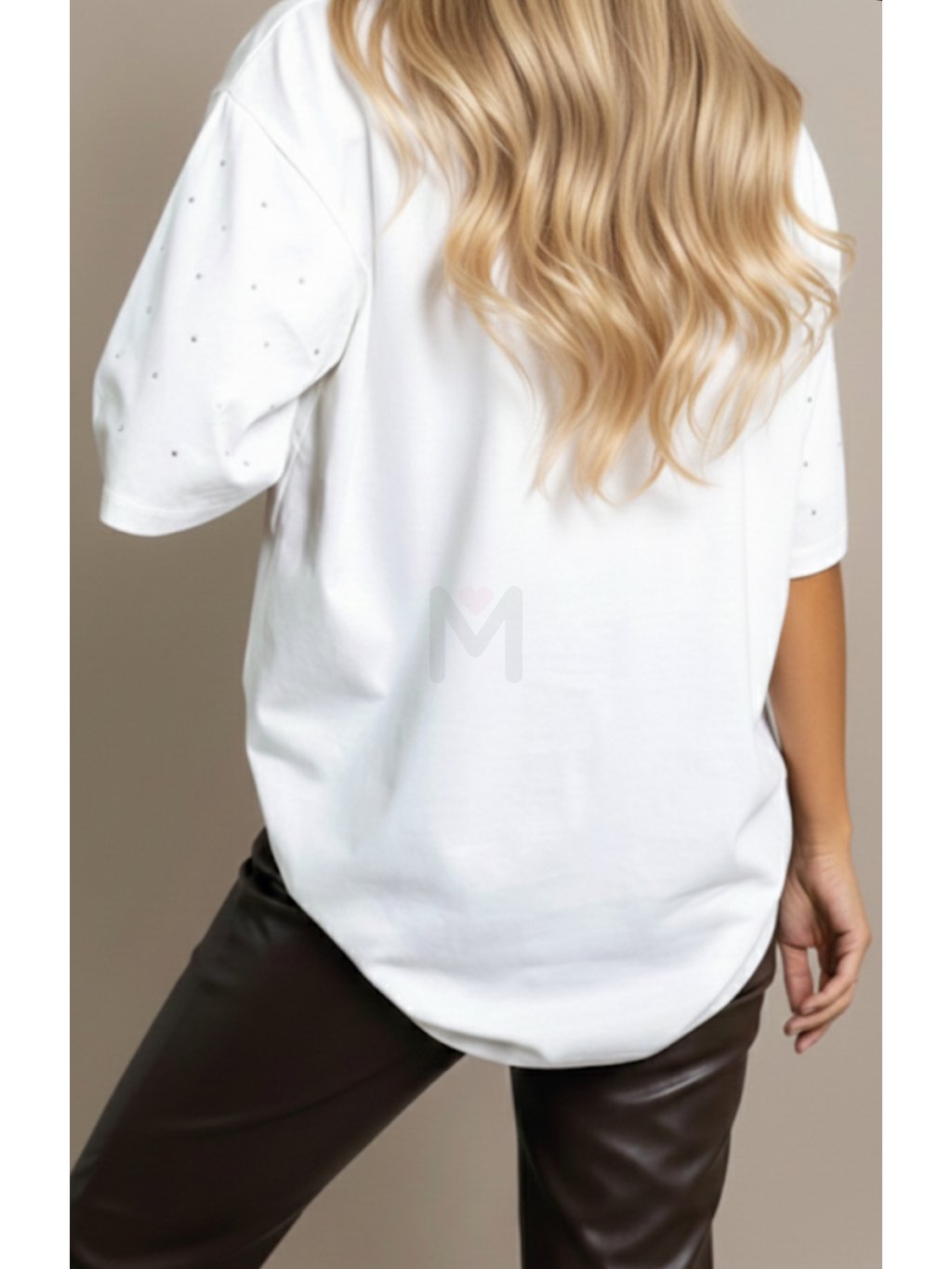Bílé bavlněné triko oversize s kulatým výstřihem, krátkými rukávy a jemnými lesklými kamínky po celé ploše pro nenucený, elegantní look.