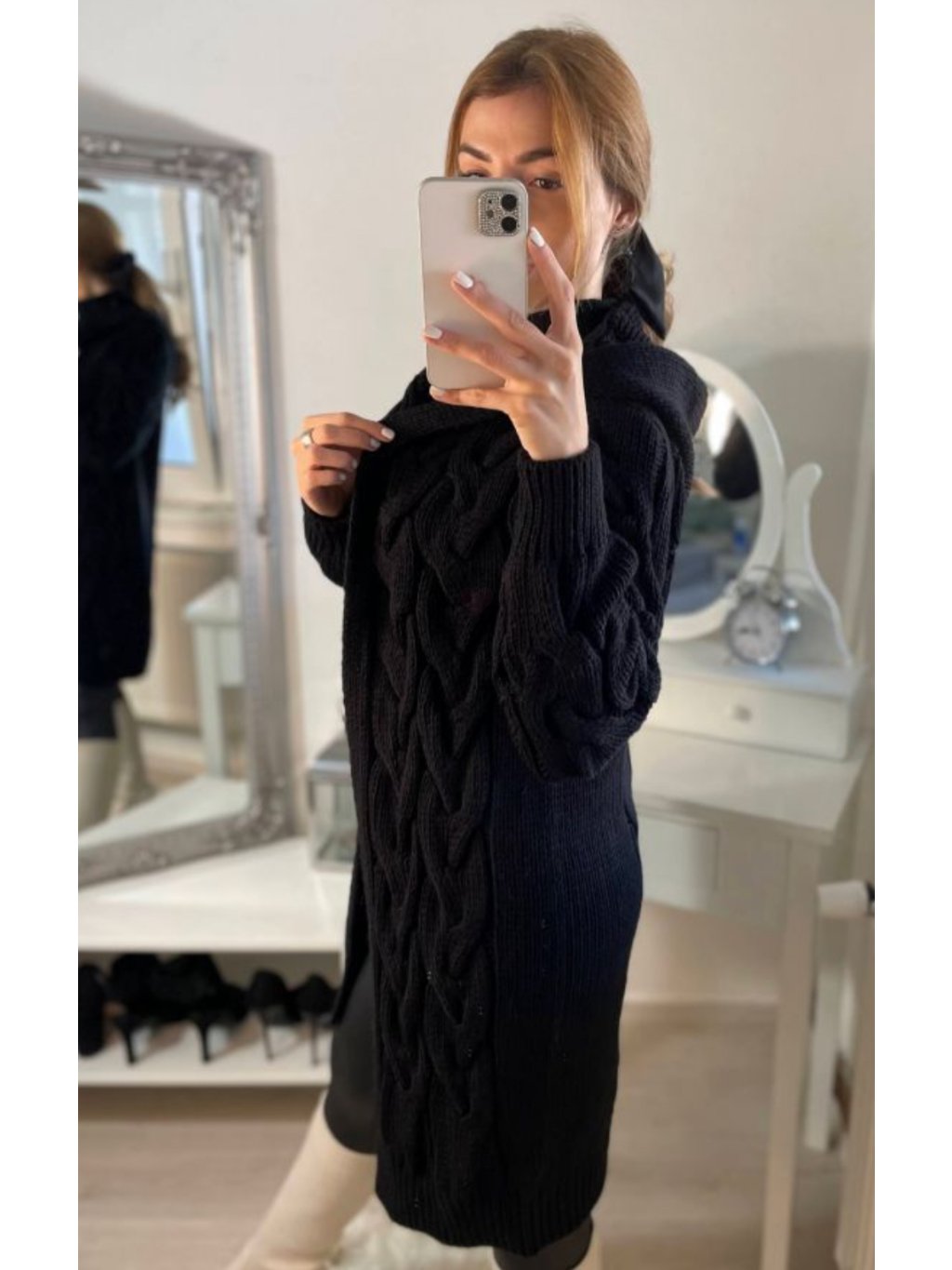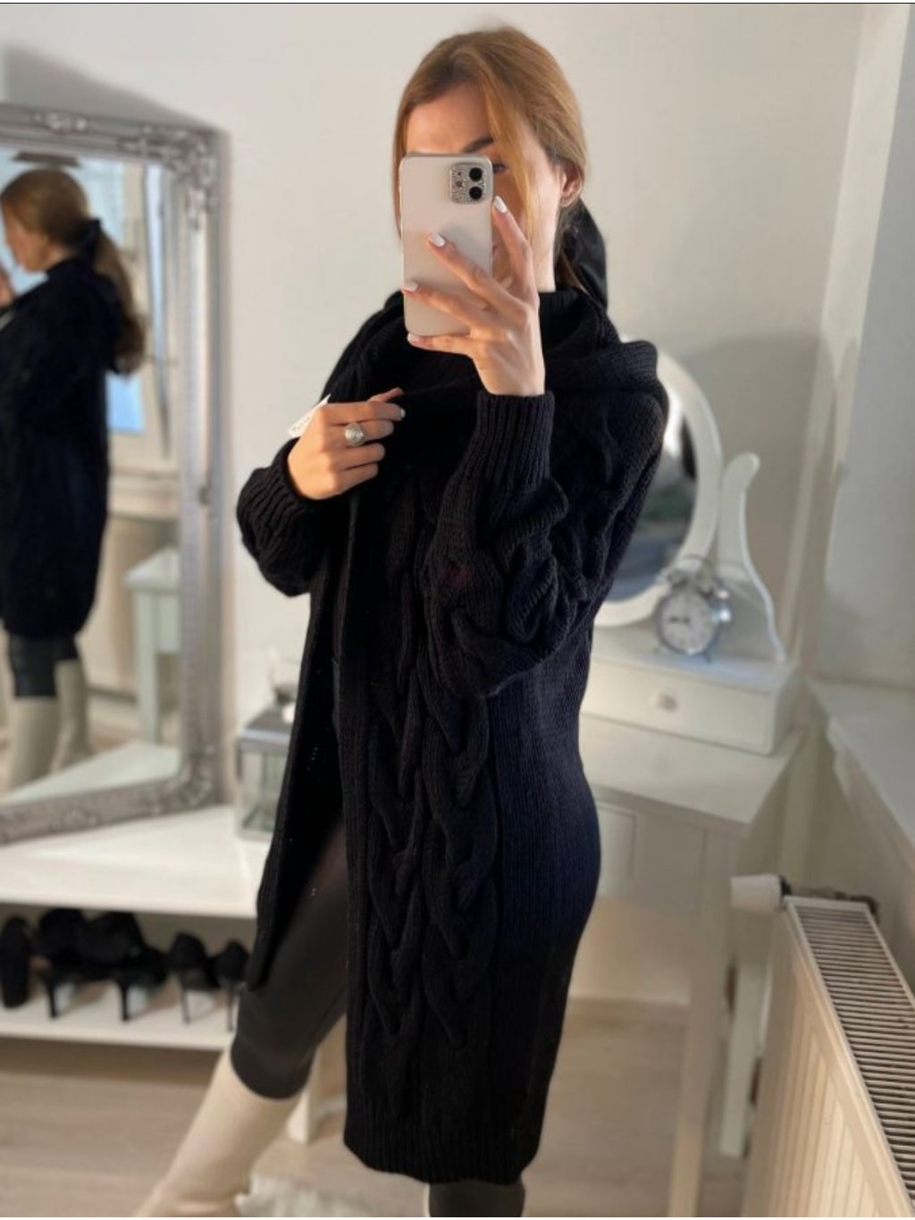 Svetr s kapucí v černé barvě, vyrobený z měkké a teplé příze s výrazným copánkovým vzorem. Tento dámský pletený svetr nabízí pohodlný volný střih, který skvěle padne a zahřeje v chladnějších dnech. Kapuce dodává modelu sportovní nádech a zároveň ochranu před větrem. Rukávy i spodní lem jsou zakončeny pružnou žebrovanou manžetou, která zajišťuje lepší přilnutí. Ideální svetr pro každodenní nošení, který se dobře kombinuje s různým stylem oblečení.
