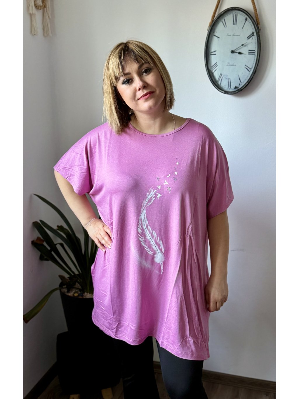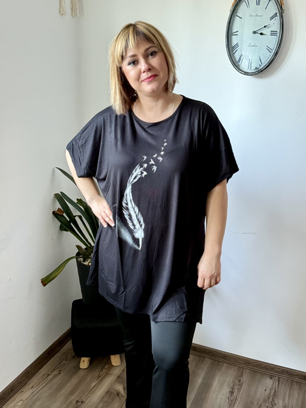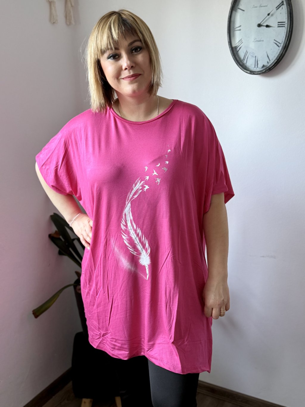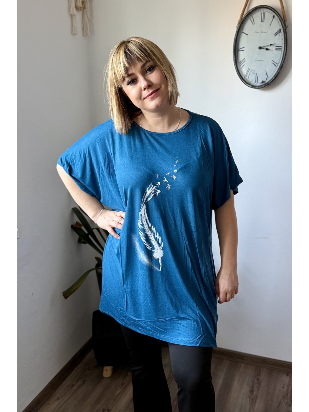 Objevte oblíbenou tuniku, která kombinuje maximální pohodlí s moderním oversize střihem. Materiál 95 % viskóza a 5 % lycra zaručuje hebký omak, přirozený pad a mírnou elasticitu pro lepší přizpůsobení tělu. Tunika má široký výstřih, krátké rukávy a dostatečnou délku, která zakryje boky — ideální k legínám, úzkým kalhotám nebo jako vrstva přes šaty. Díky široké paletě 11 barev snadno najdete odstín podle nálady i sezóny. Potisk dodává modelu osobitý styl.