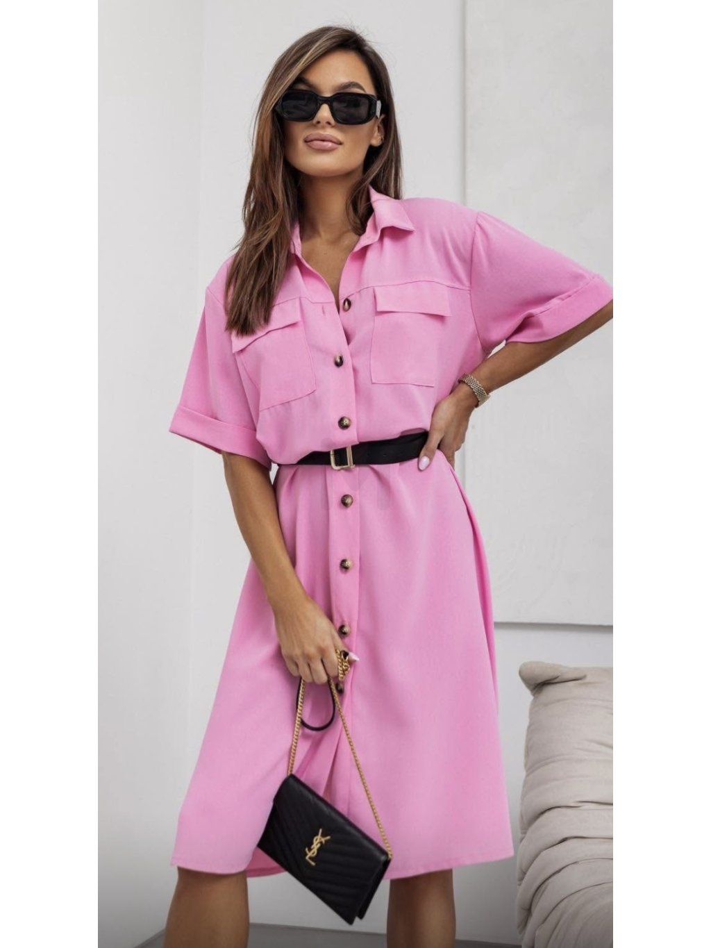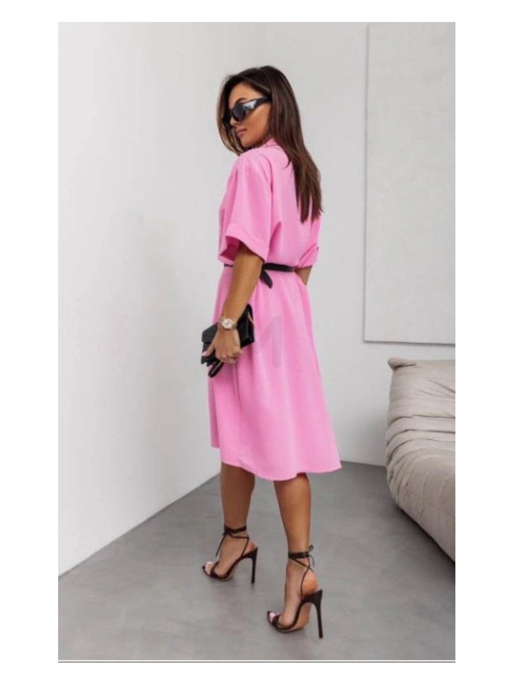 Elegantní a nadčasové dámské košilové šaty s páskem, které jsou ideální volbou pro každodenní nošení i elegantnější příležitosti. Díky volnějšímu střihu a pásku v pase krásně zvýrazní siluetu a přizpůsobí se postavě.
