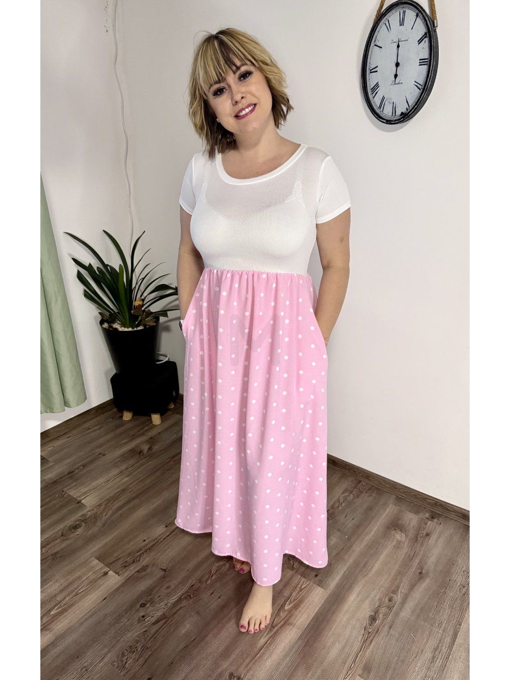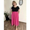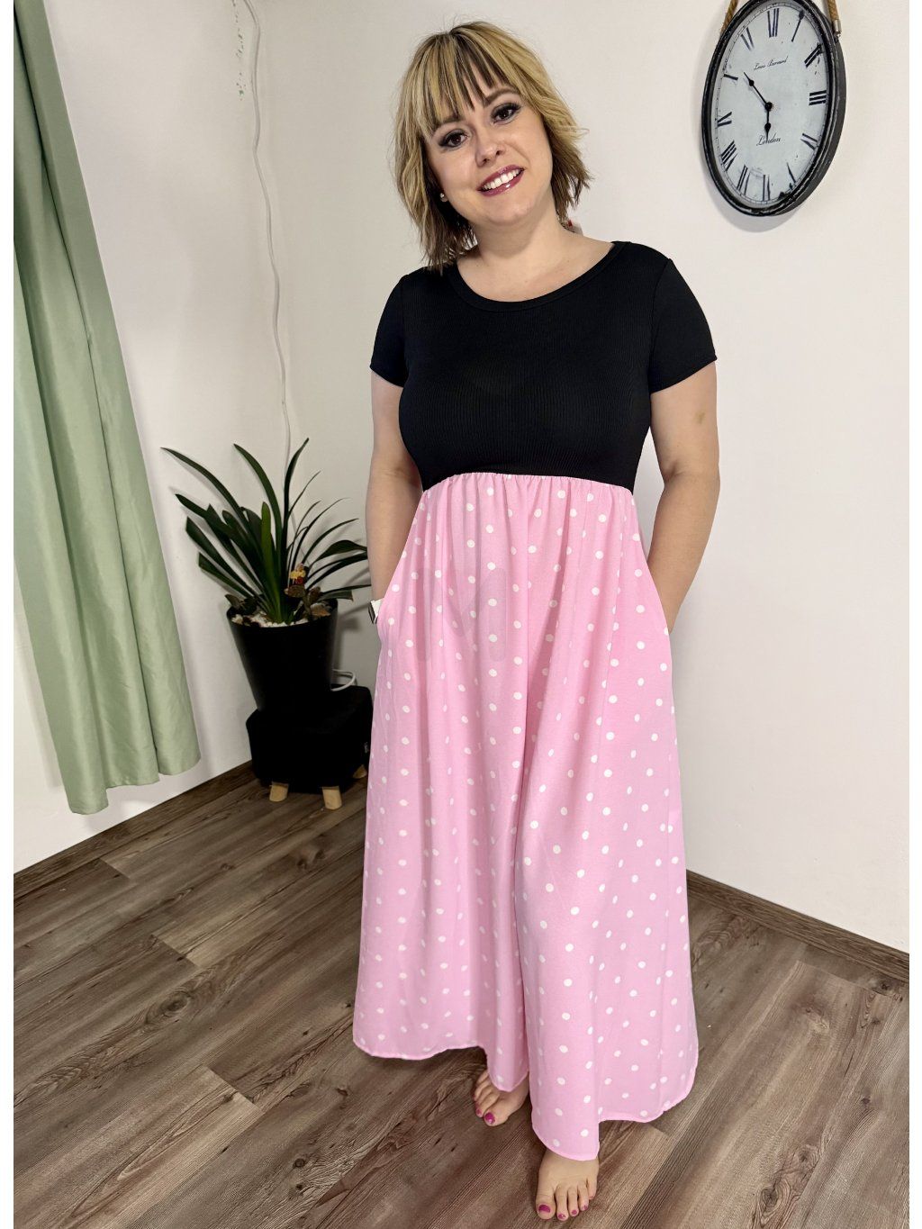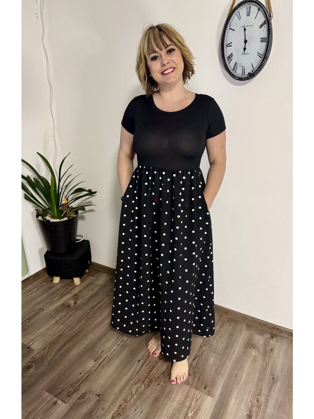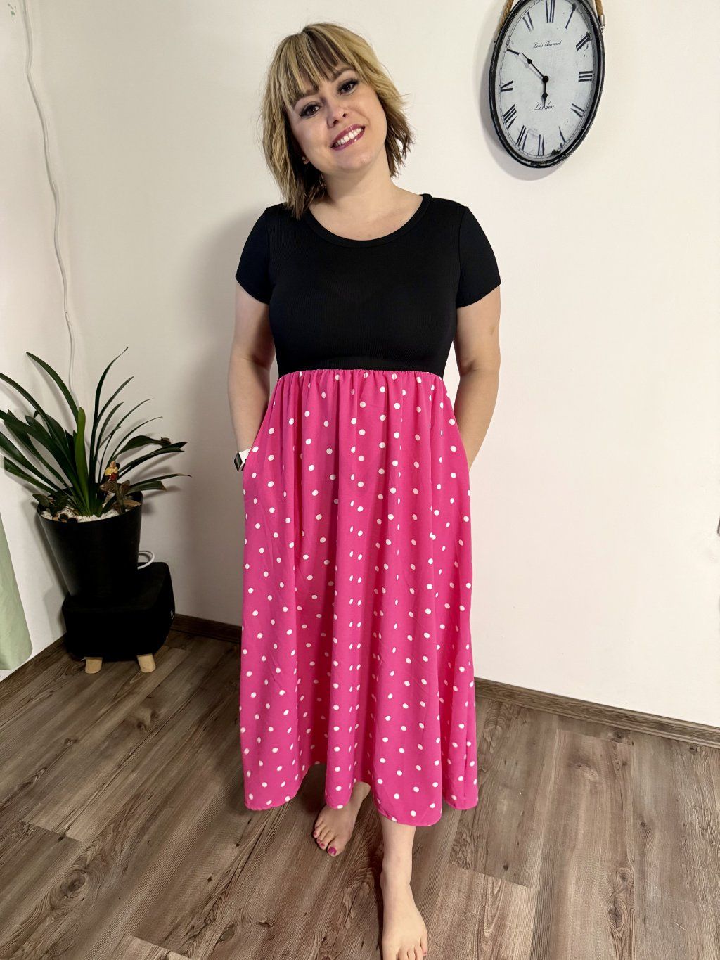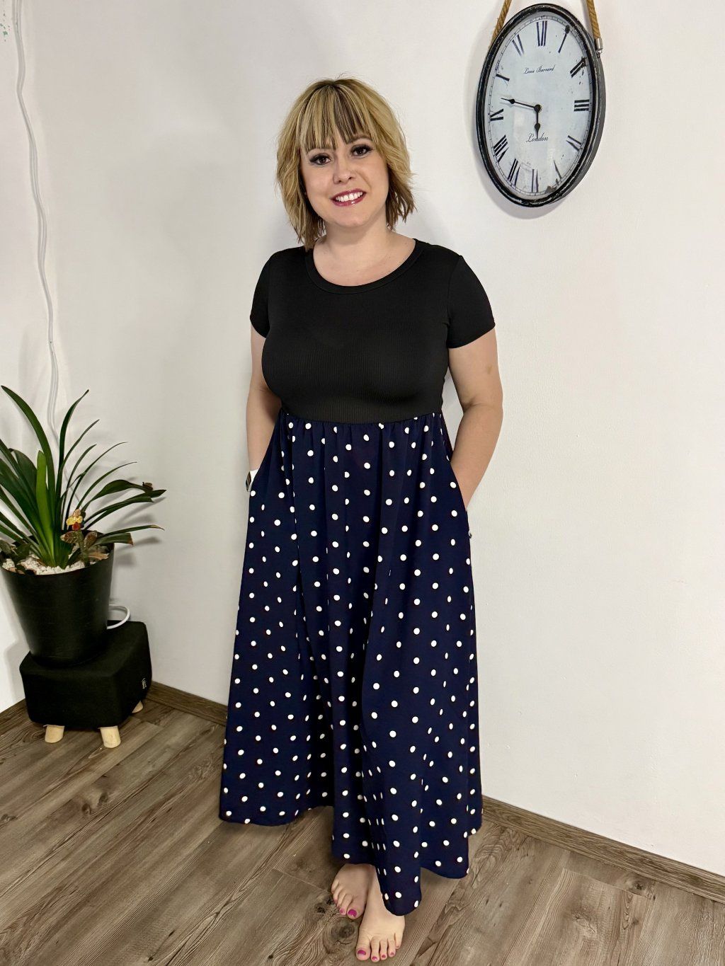 Stylové a maximálně pohodlné šaty, které si zamilujete na první obléknutí. Horní část z pružného materiálu se krásně přizpůsobí postavě, zatímco volná sukně s puntíky lichotivě splývá a poskytuje dostatek prostoru i pro plnější tvary.