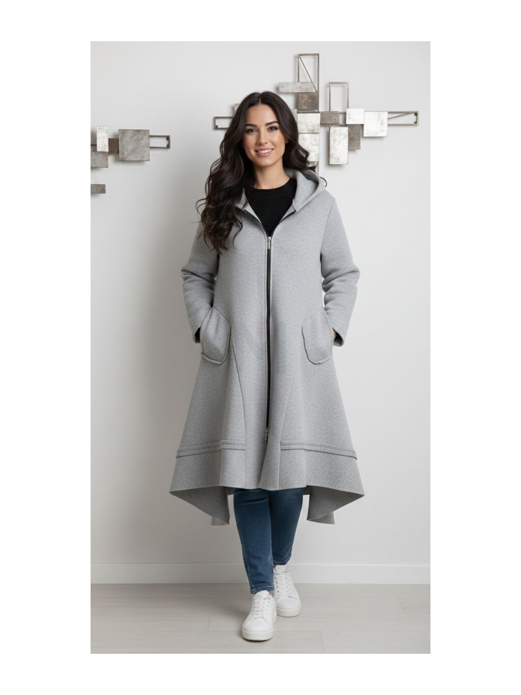 Objevte ideální spojení pohodlí a městské elegance s tímto světle šedým asymetrickým kabátem. Kabát má čisté, minimalistické linie, které podtrhuje rozšířený A-liniový střih a decentní asymetrický lem — přední část elegantně padne, zadní část jemně prodlouží siluetu. Praktická kapuce a hluboké kapsy s klopou zajišťují pohodlí i v chladnějším či větrném počasí, zatímco dvoucestný zip umožňuje snadné zapínání a variabilní nošení. Díky neutrální šedé barvě se kabát lehce kombinuje s džínami i šaty — ideální do města i na víkendové vycházky.