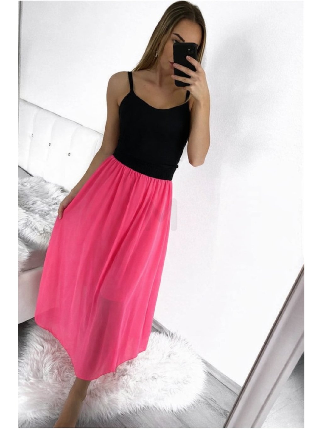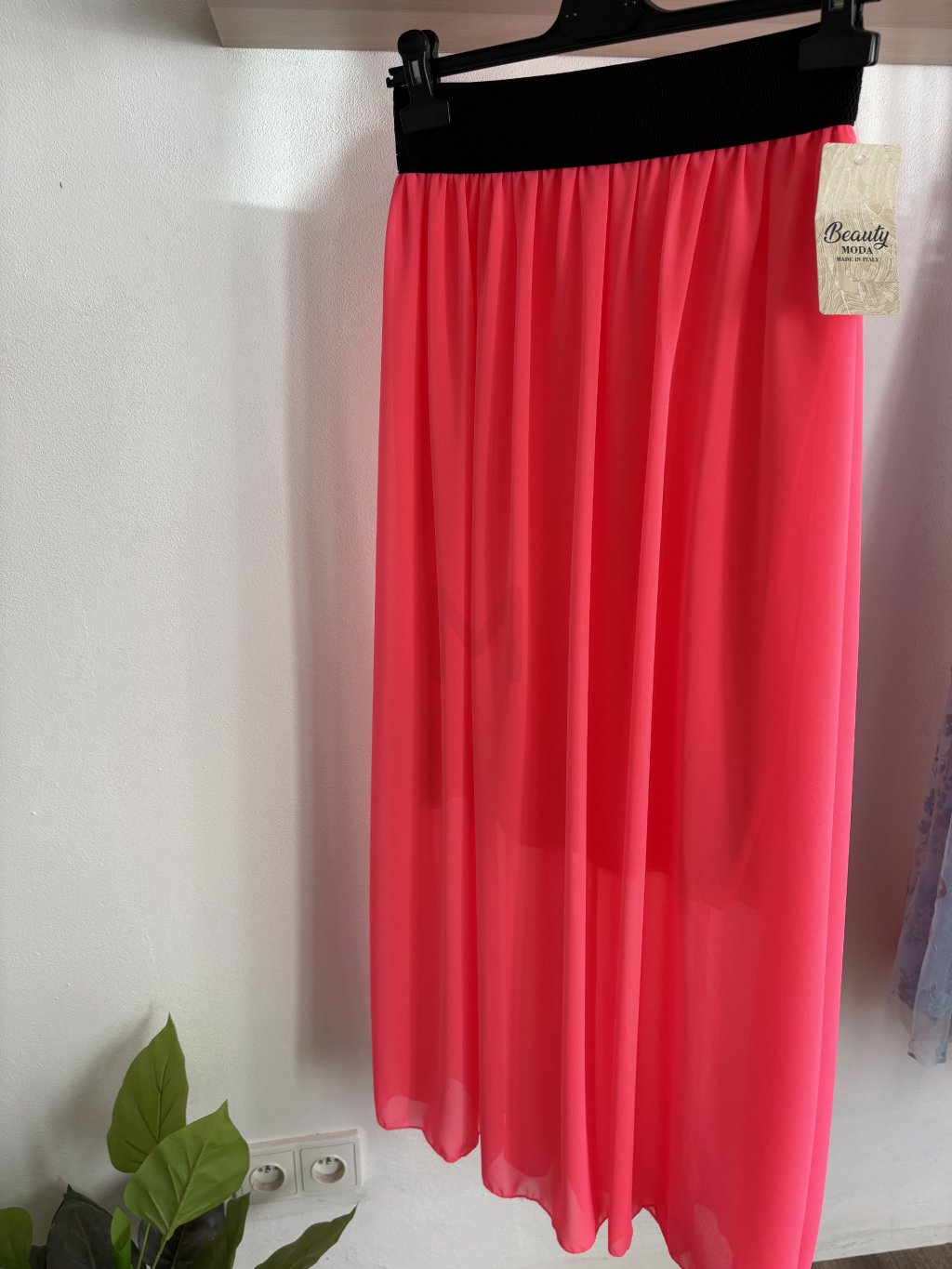 Vzdušná maxi sukně v nepřehlédnutelné neonově růžové barvě je dokonalým kouskem pro ženy, které se nebojí zazářit. Jemný, splývavý materiál krásně pracuje při chůzi a vytváří elegantní, ženskou siluetu.