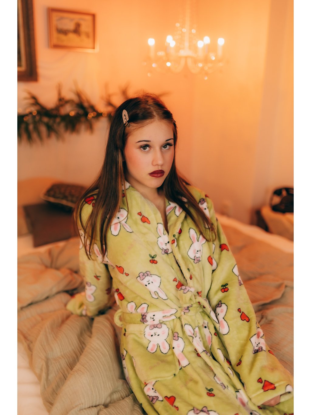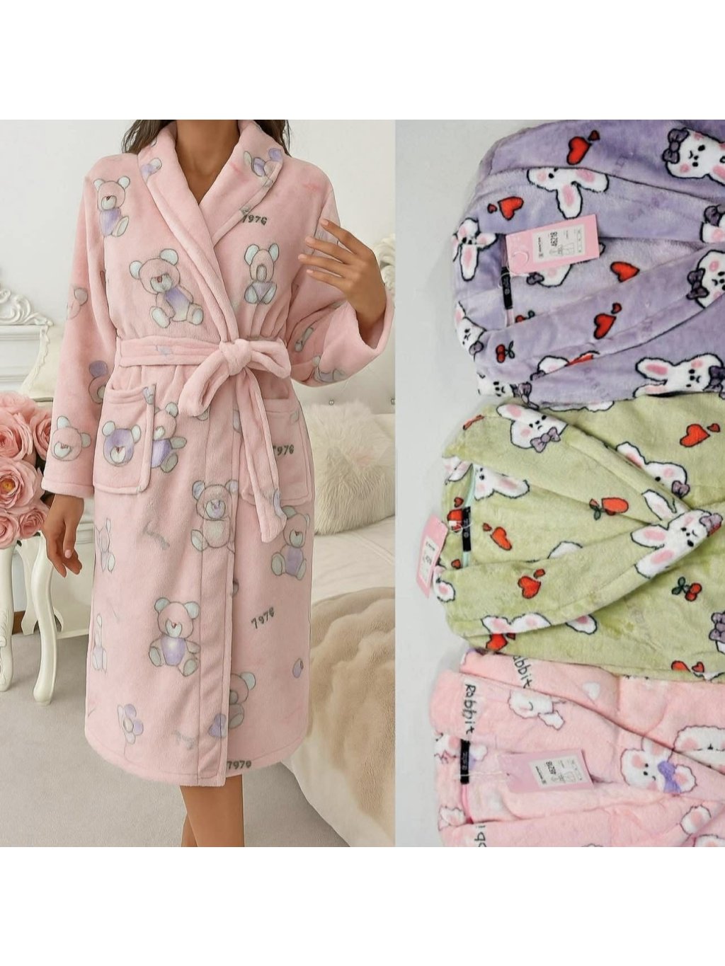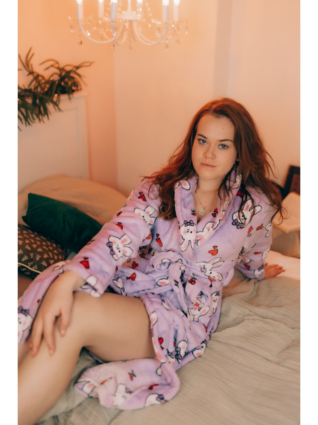 Útulný a hebký plyšový župan v něžné fialové barvě s roztomilým potiskem králíčků. Ideální na lenivé rána, večerní relaxaci nebo jako stylový dárek pro každou milovnici pohodlí.