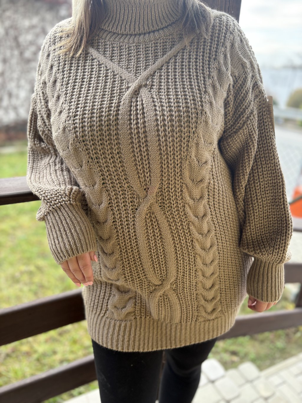 Zabalte se do měkkého pohodlí s tímto stylovým oversize svetrem v nadčasové béžové barvě. Svetr je pletený z výrazného copánkového vzoru, který mu dodává šmrnc a luxusní vzhled.