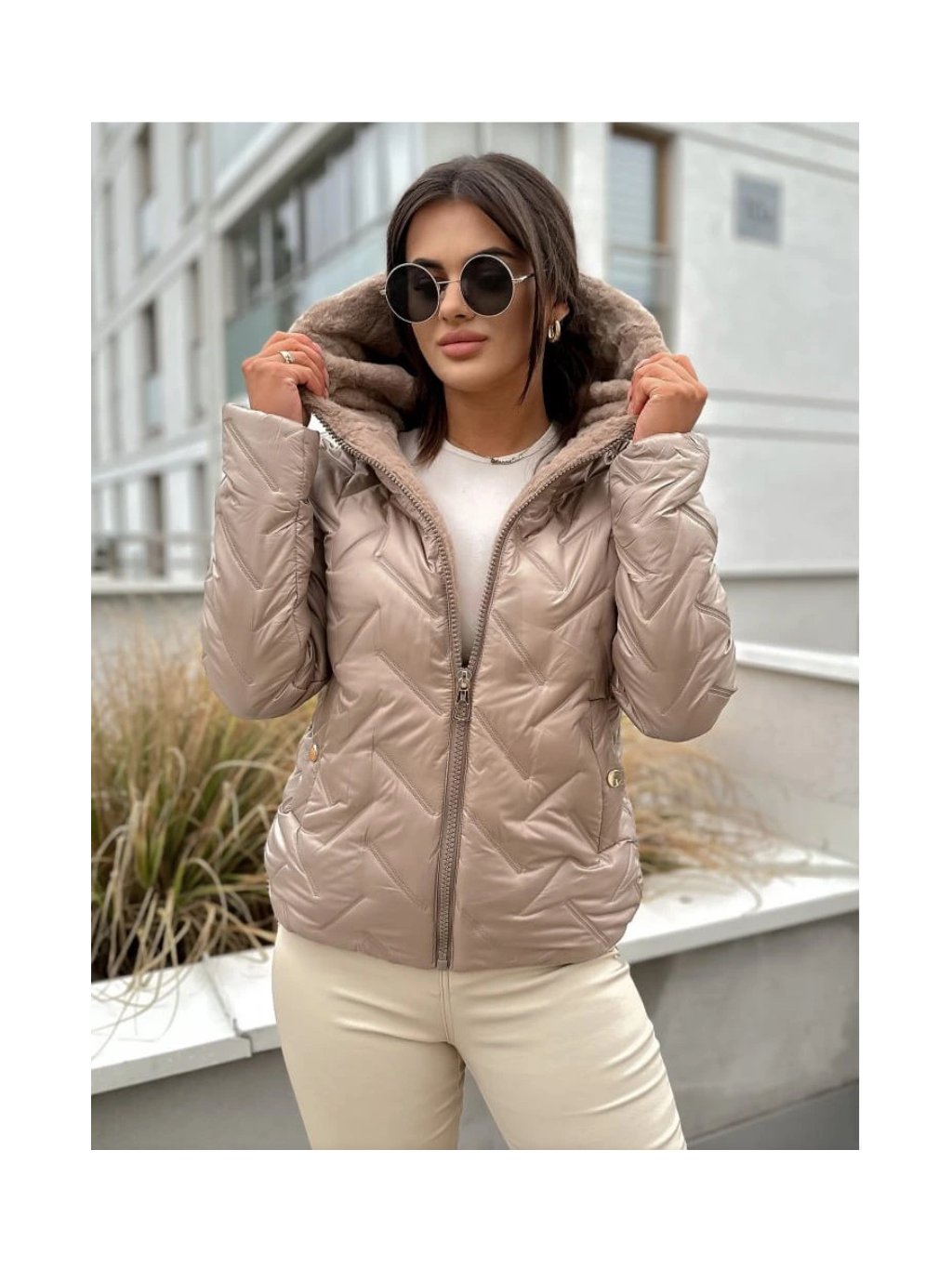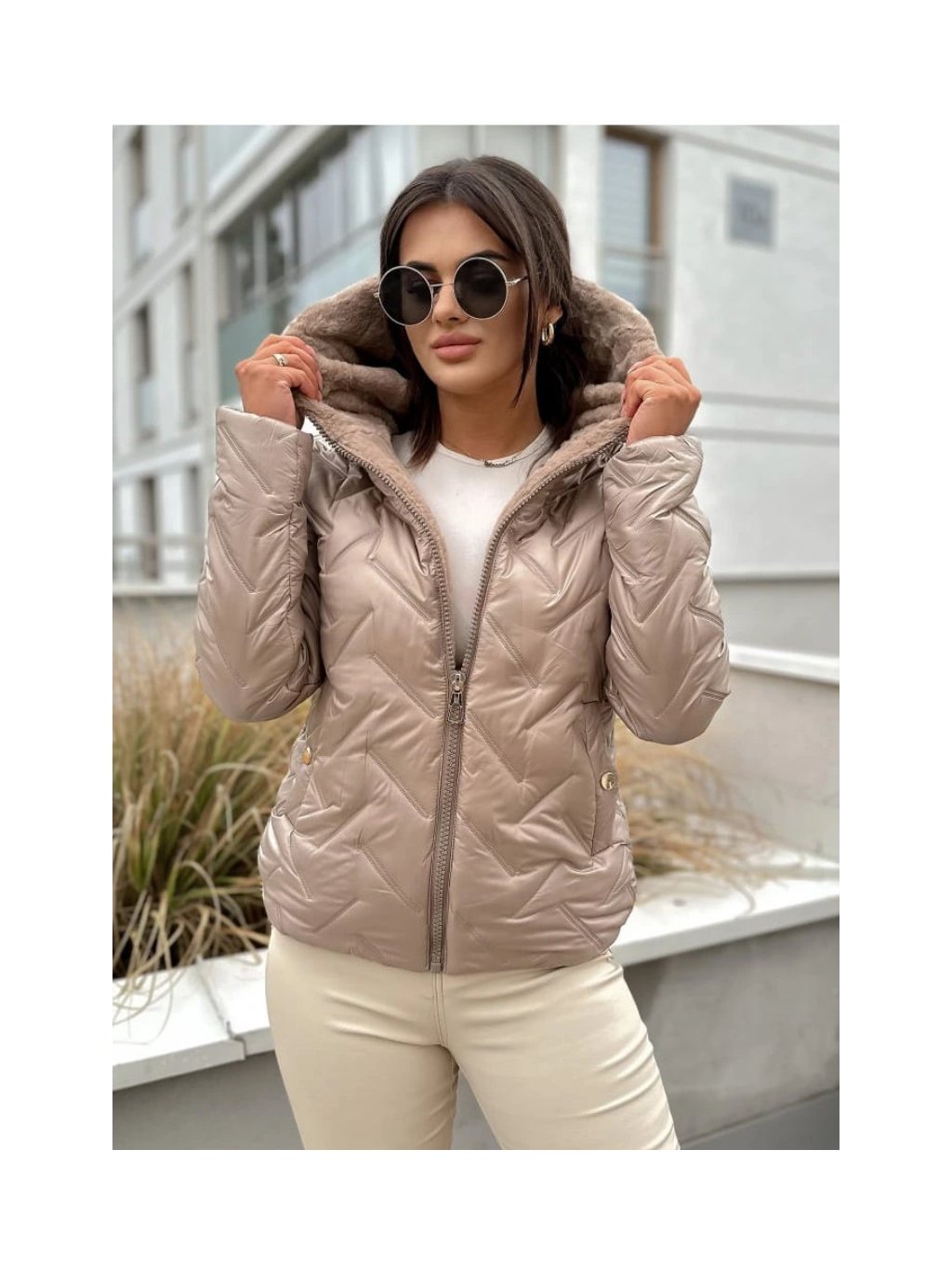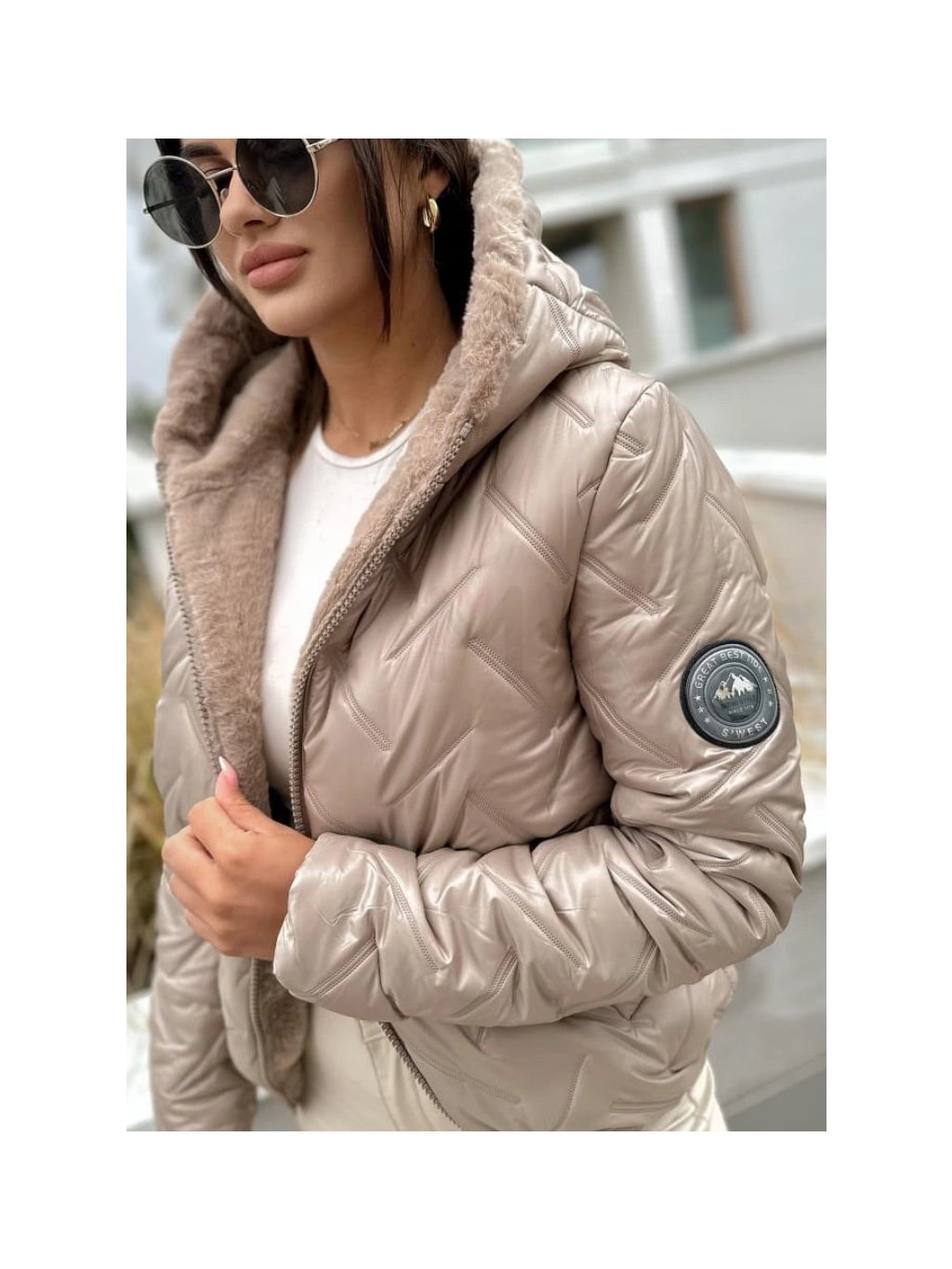 • Design a materiál: Bunda má jemný perleťový odlesk v krémové (champagne) barvě. Povrch zdobí originální geometrické prošívání, které bundě dodává dynamický a moderní vzhled.